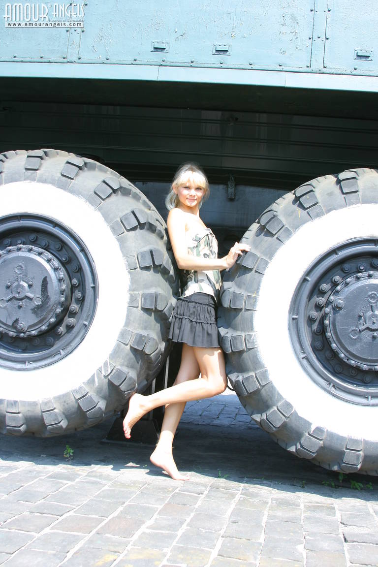 Gorgeous cheeky angel is wearing military clothes and poses near grenade launcher, tank and different army airplanes.