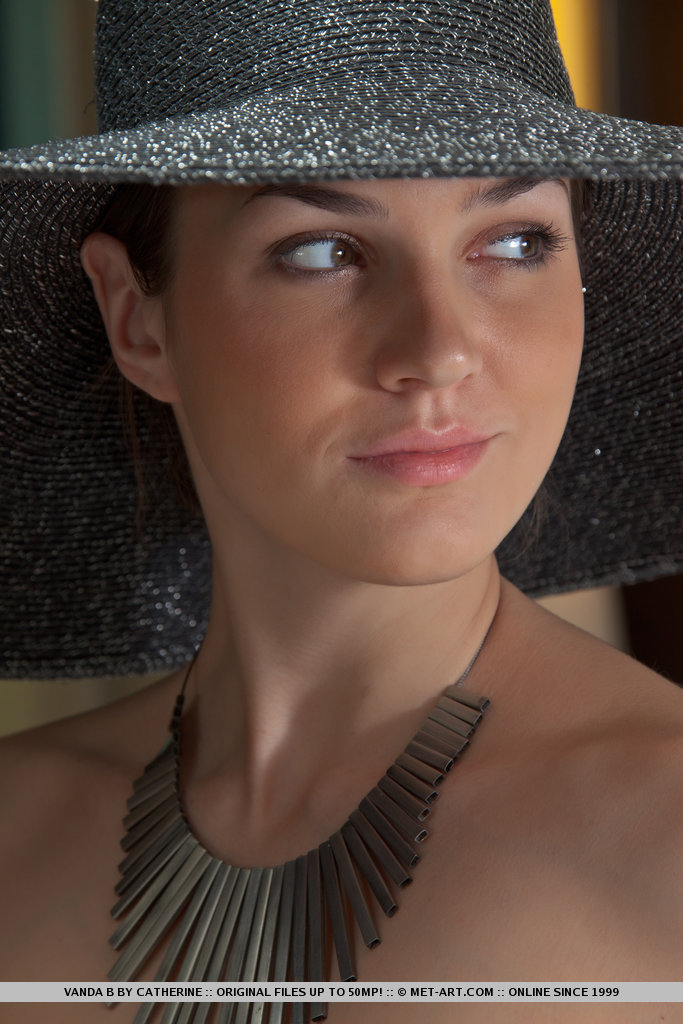 Wearing a broad brimmed hat, a chunky piece of necklace, and a sheer black panty, veranda exudes elegance as well as lusty romance as she sprawls enticingly on the bed.